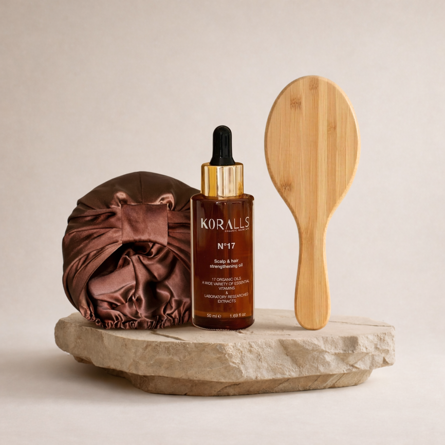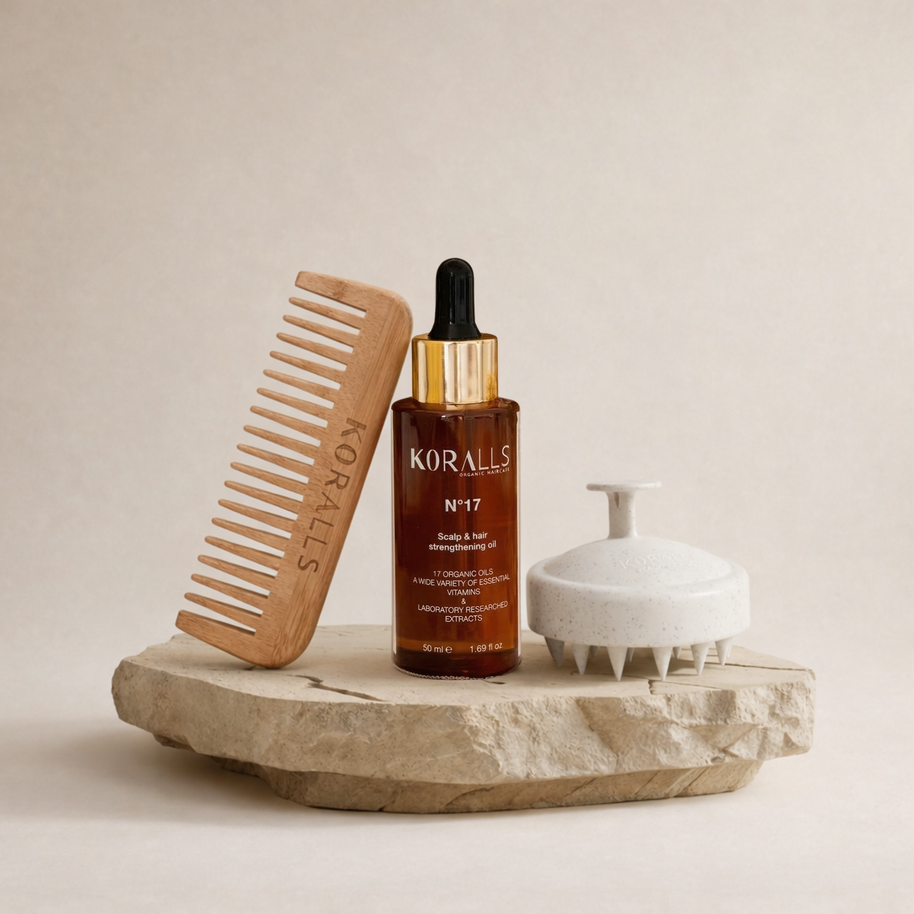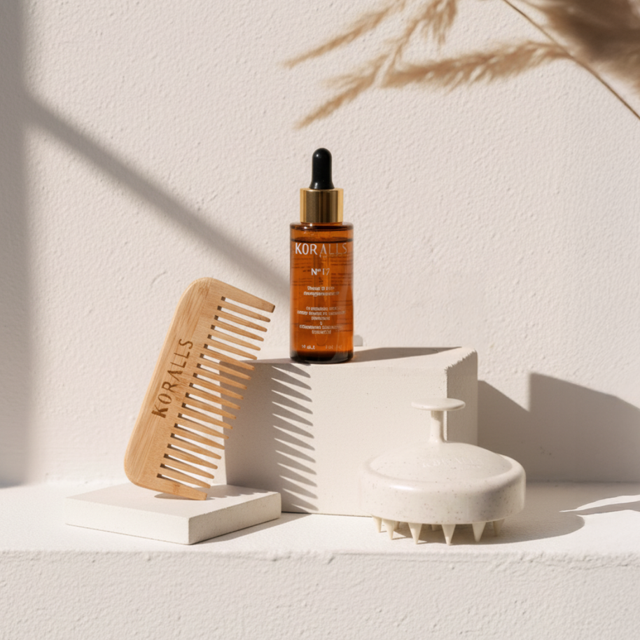 Entdecke, wie unser Hair Oil N°17, die Scalp Brush und der Bambuskamm zusammenwirken, um deine Kopfhaut zu beruhigen, dein Haar zu stärken und deinen Alltag mit einem Moment echter Self-Care zu bereichern.Natürliche Bio-Öle, sanfte Tools und eine Routine, die spürbar gut tut – für geschmeidiges, gesund aussehendes Haar und eine Kopfhaut, die im Gleichgewicht ist.Vegane Pflege. Nachhaltige Materialien. Maximale Wirkung.